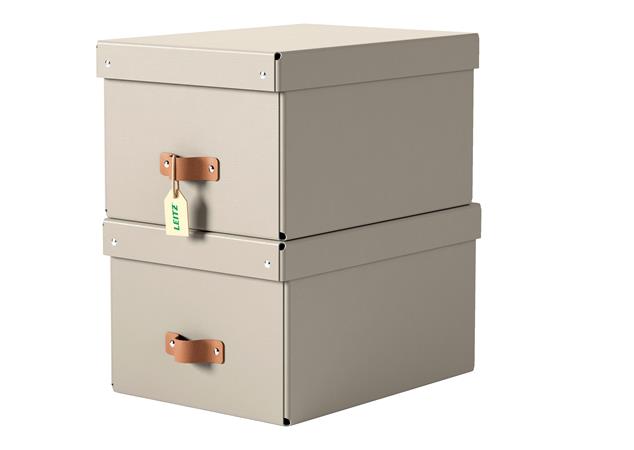 Štýlová kožená rukoväť uľahčuje vyberanie kartónových úložných boxov z políc, úložných či šatníkov.
