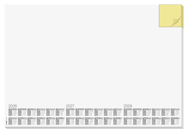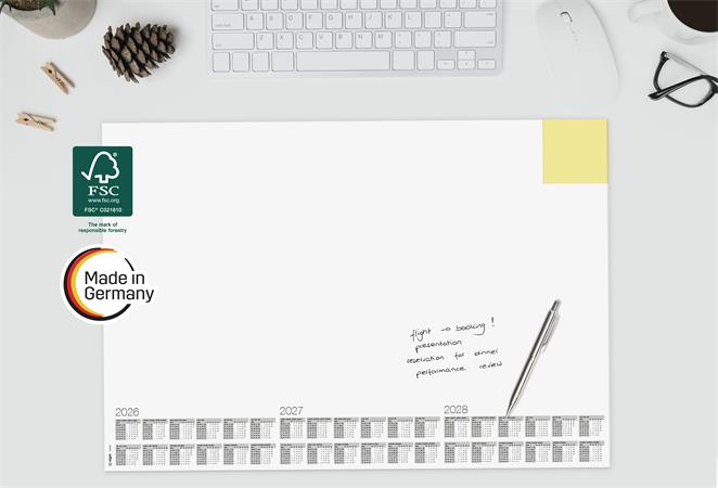 s trojročným kalendárom (2026/2027/2028) -štvorjazyčný: angličtina, nemčina, francúzština a holandčina -veľkosť: približne A2 -odolný, protišmykový a vďaka masívnej kartónovej zadnej doske úplne rovno leží -použiteľný aj ako podložka pod myš -30 listov -farba: biela -s certifikátom FSC
