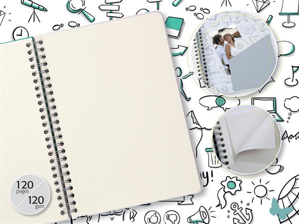Pevná väzba s matným motívom, strieborná dvojitá špirálová väzba, mikroperforované listy, 120 strán s bodkovanou mriežkou, biely papier s gramážou 100 g/m², zaoblené rohy, vrecko na zadnej strane obalu, certifikovaná FSC, vegánsky produkt.
