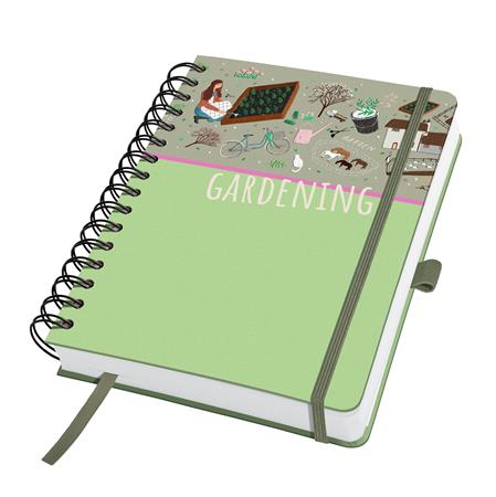 Špirálový zošit s tvrdou obálkou, s motívom záhrady -matný motív - čierna špirálová väzba  -mikroperforované listy -240 čistých strán -120 g biely papier -vrecko na zadnej stane obalu -70% používaného materiálu s certifikátom FSC -vegánsky produkt