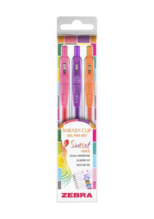 Sada gélových pier Sarasa Clip v troch kusoch „Sunset“ s jedinečnými farebnými kombináciami a veselým balením určite vynikne medzi ostatnými písacími potrebami.