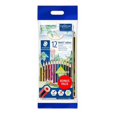 Farebné ceruzky, sada, šesťhranné, darček: grafitová ceruzka a guma, STAEDTLER "Noris Club", 12 rôznych farieb