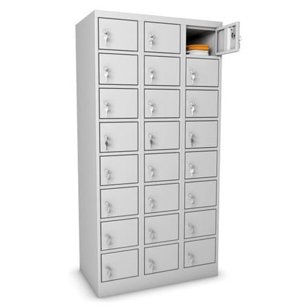 Séria „TRM”: kvalitná uzamykateľná skrinka na cennosti z oceľového plechu s 24 priehradkami, vyhotovenie so súvislým podstavcom.