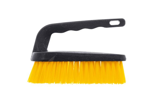 Plastová drôtená kefa s rukoväťou a plastovými štetinami, nevyhnutná pomôcka na upratovanie na odstraňovanie škvŕn a nečistôt. -pohodlná plastová rukoväť -navrhnutá na intenzívne drhnutie -robustné čistenie -rozmery: 10 x 6 cm -farba: žltá -materiál: plast